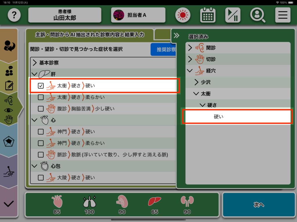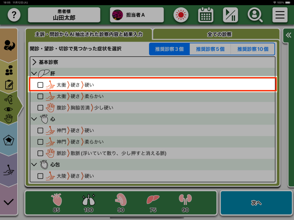 ※「肝」の下に表示される選択肢は、肝が悪い人によくみられる症状になります