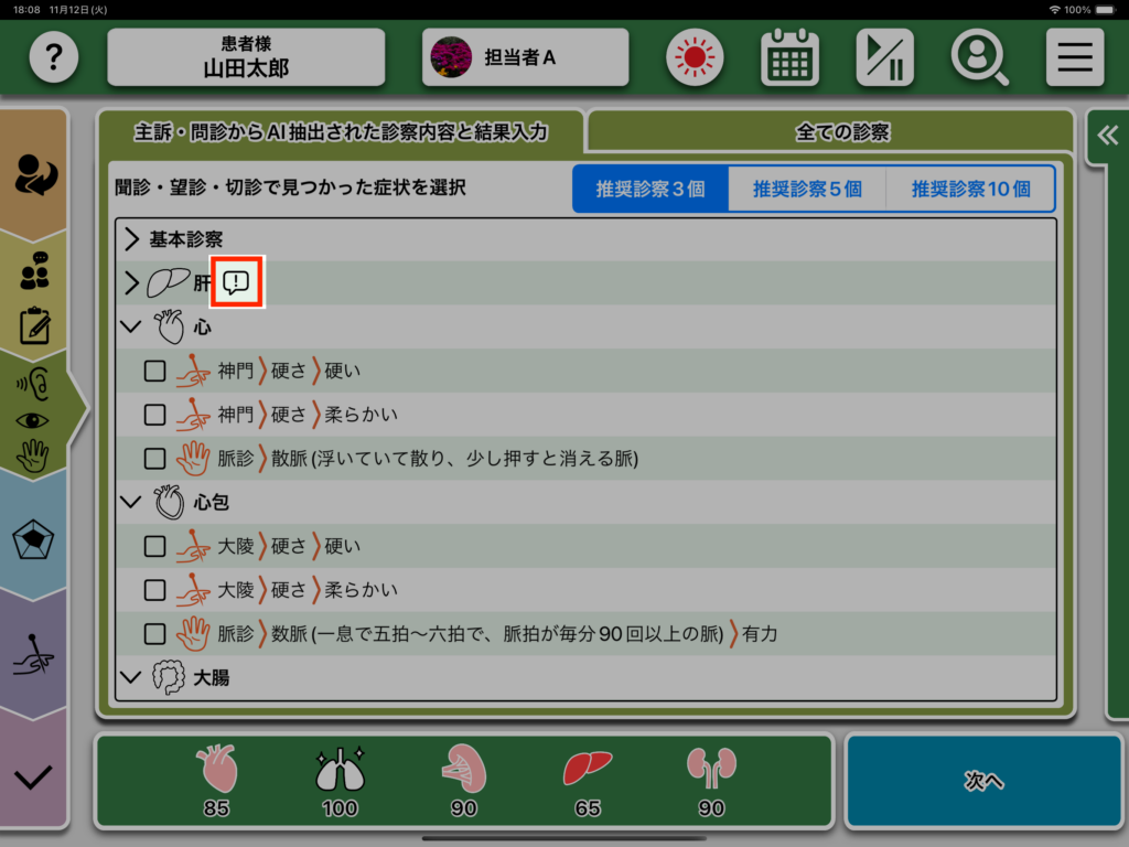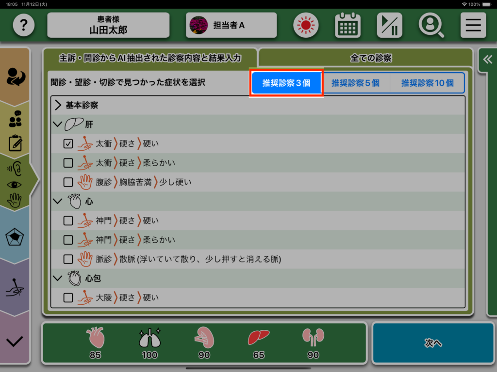 「推奨診察3個」が選択されている場合、各要素に推奨する診察項目が3個表示されます