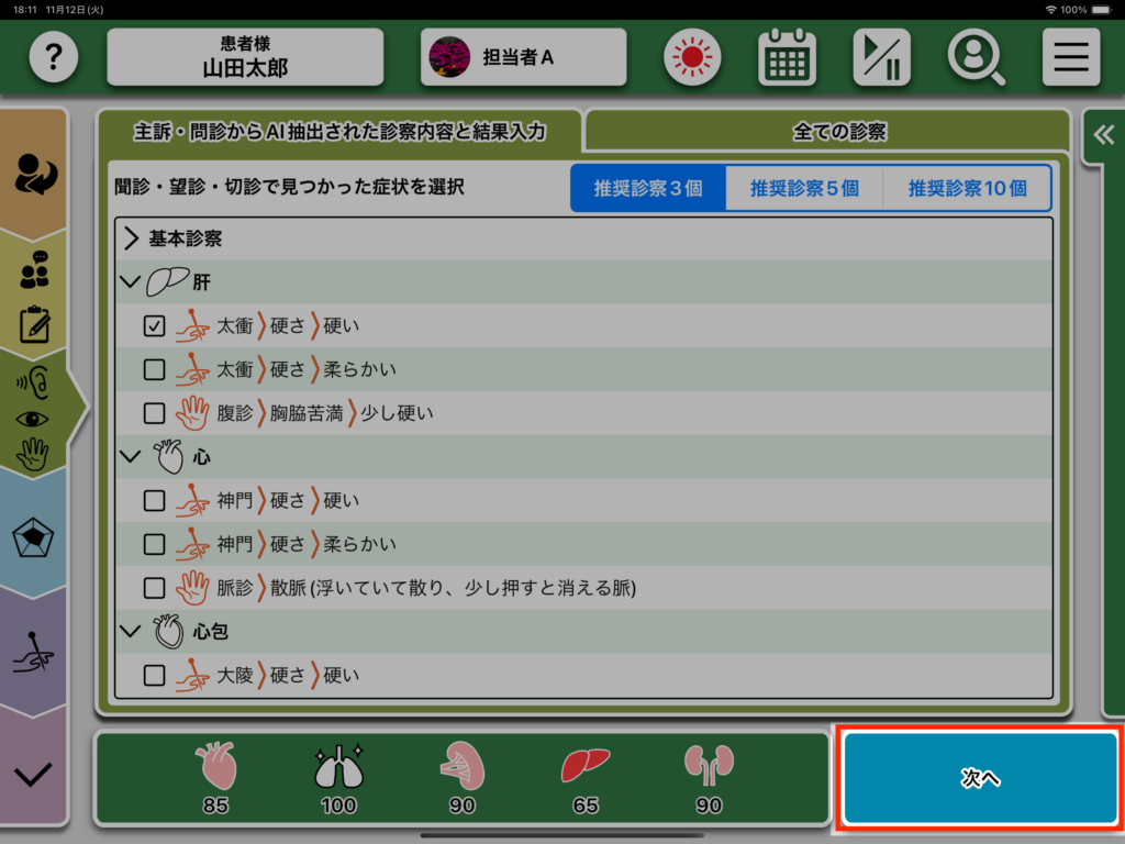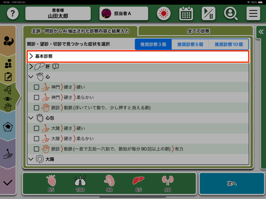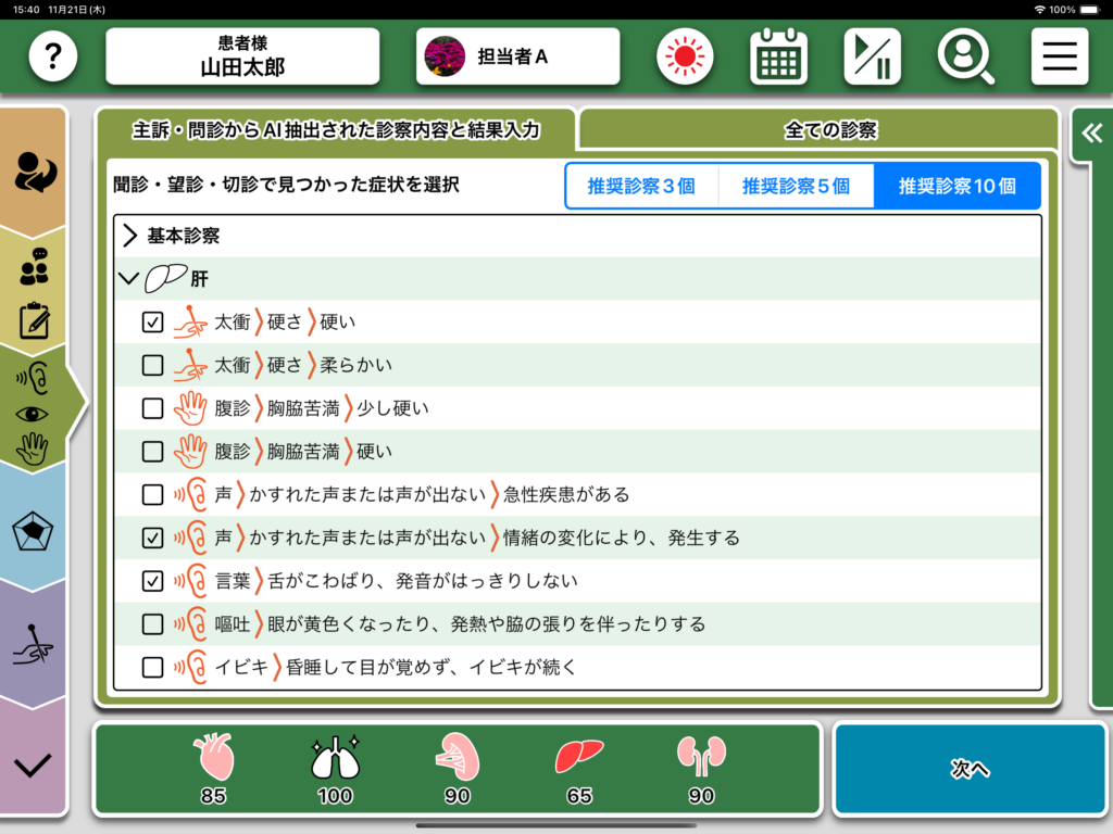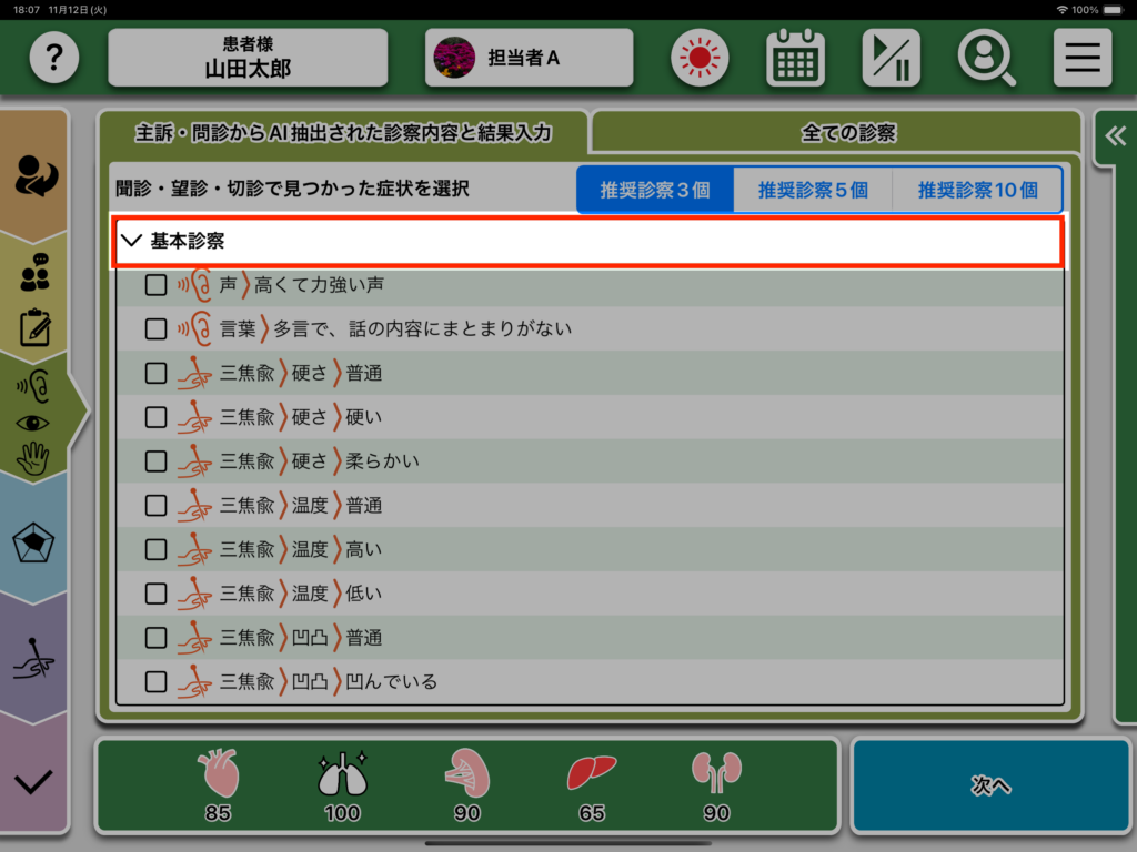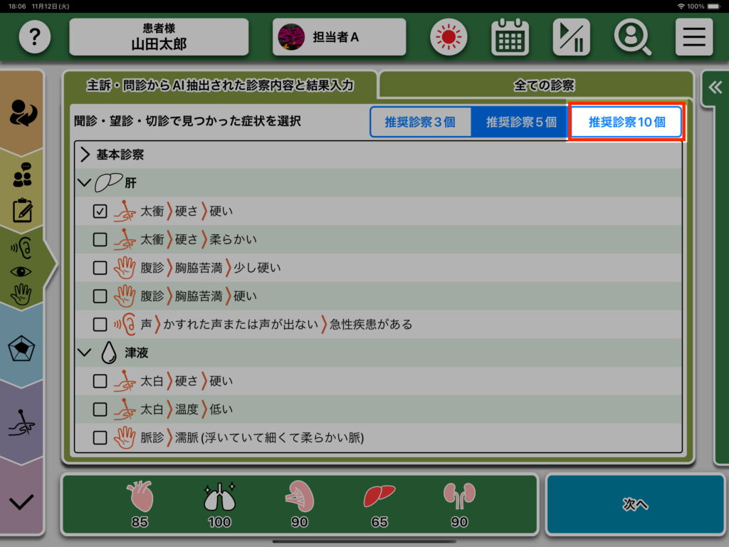 各要素に推奨する診察項目を10個表示したい場合は、「推奨診察10個」を押下します