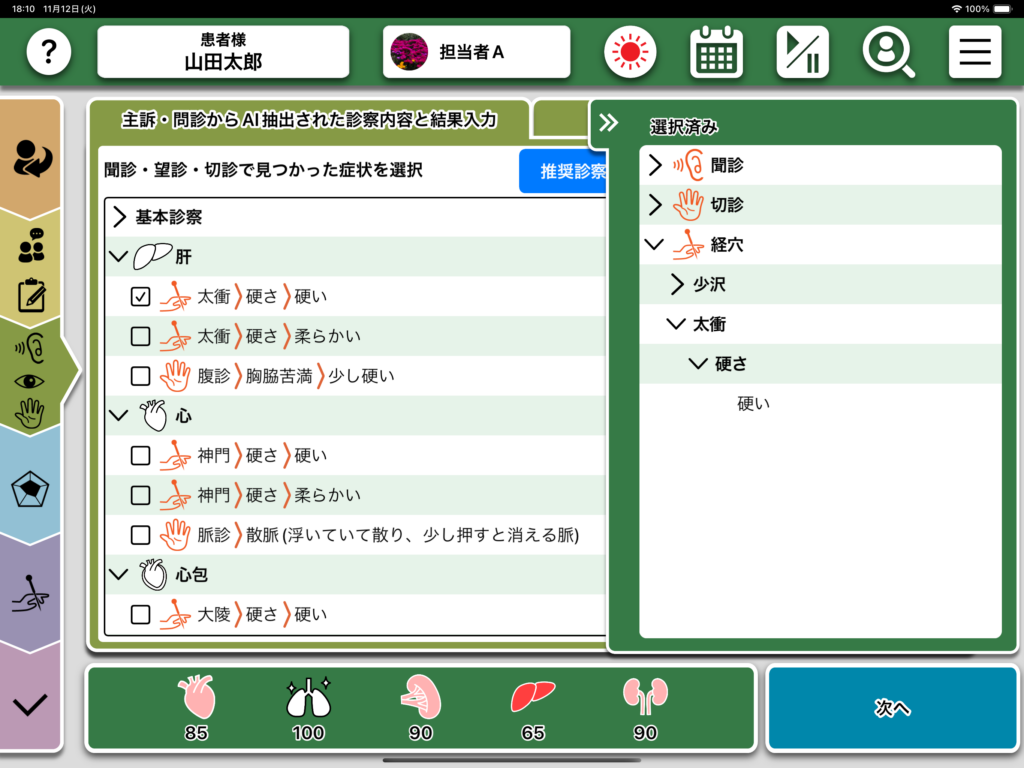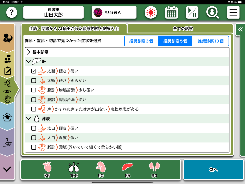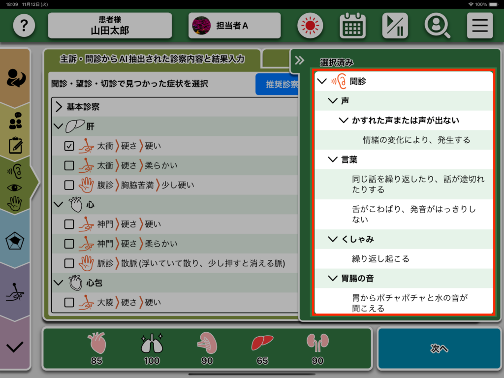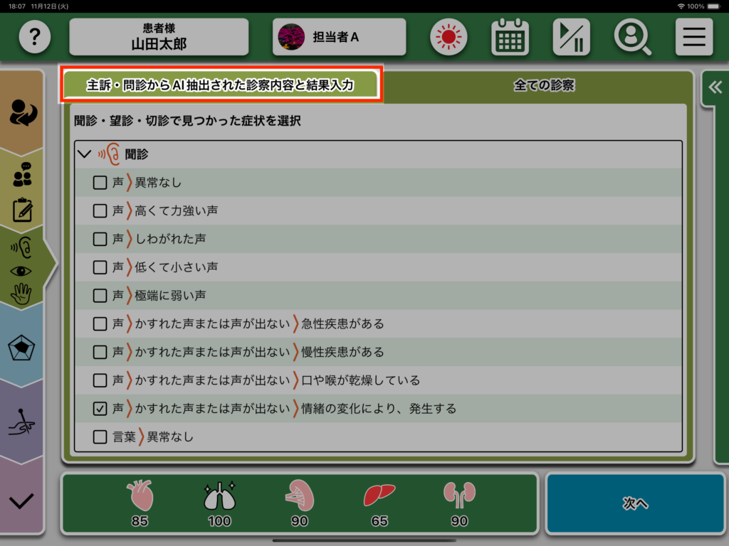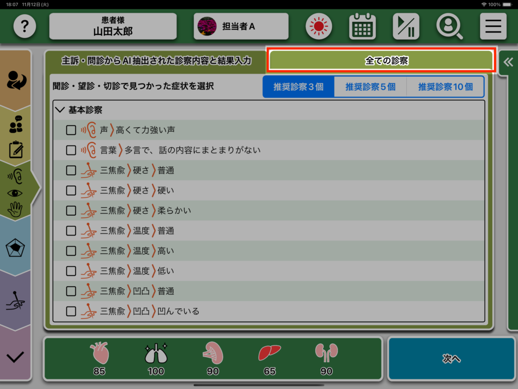 「全ての診察」タブを押下すると、聞診・望診・切診の症状が全て表示されます