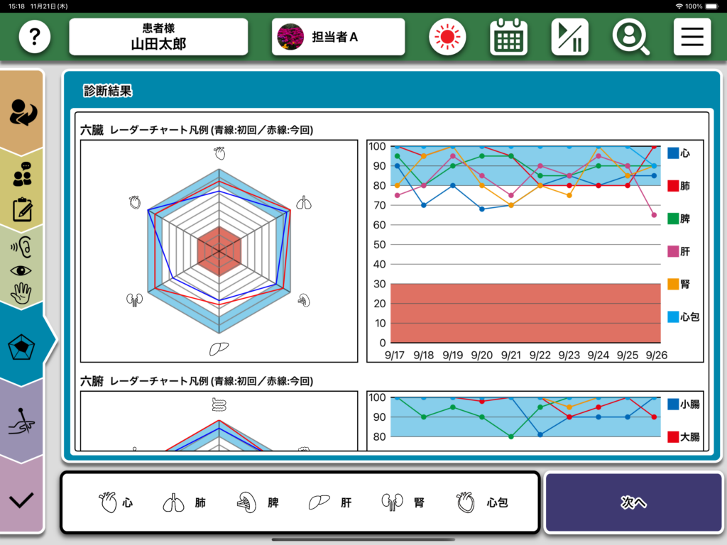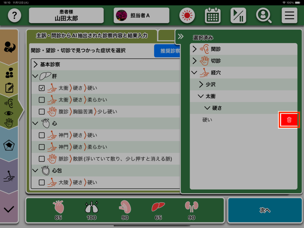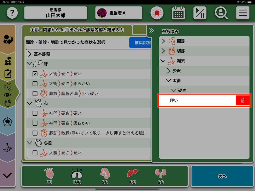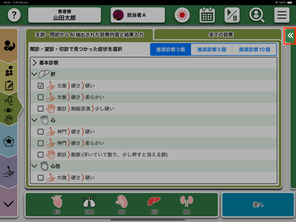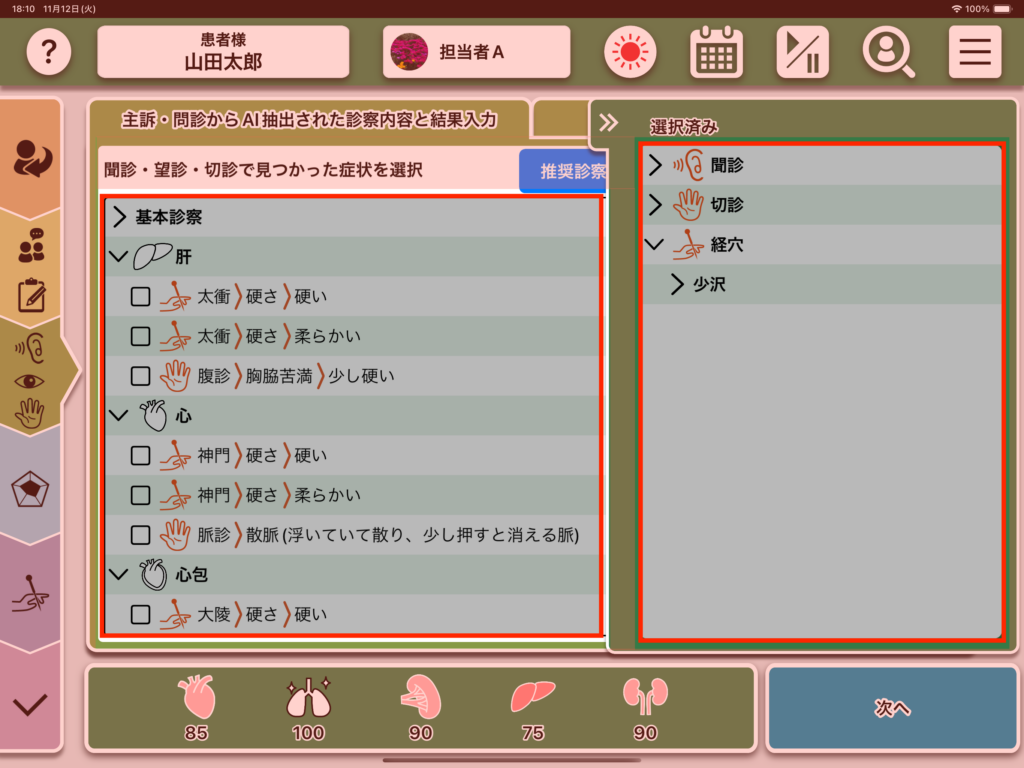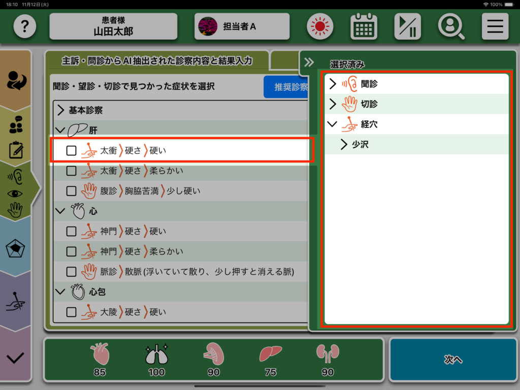 「全ての診察」タブを押下すると、聞診・望診・切診の症状が全て表示されます