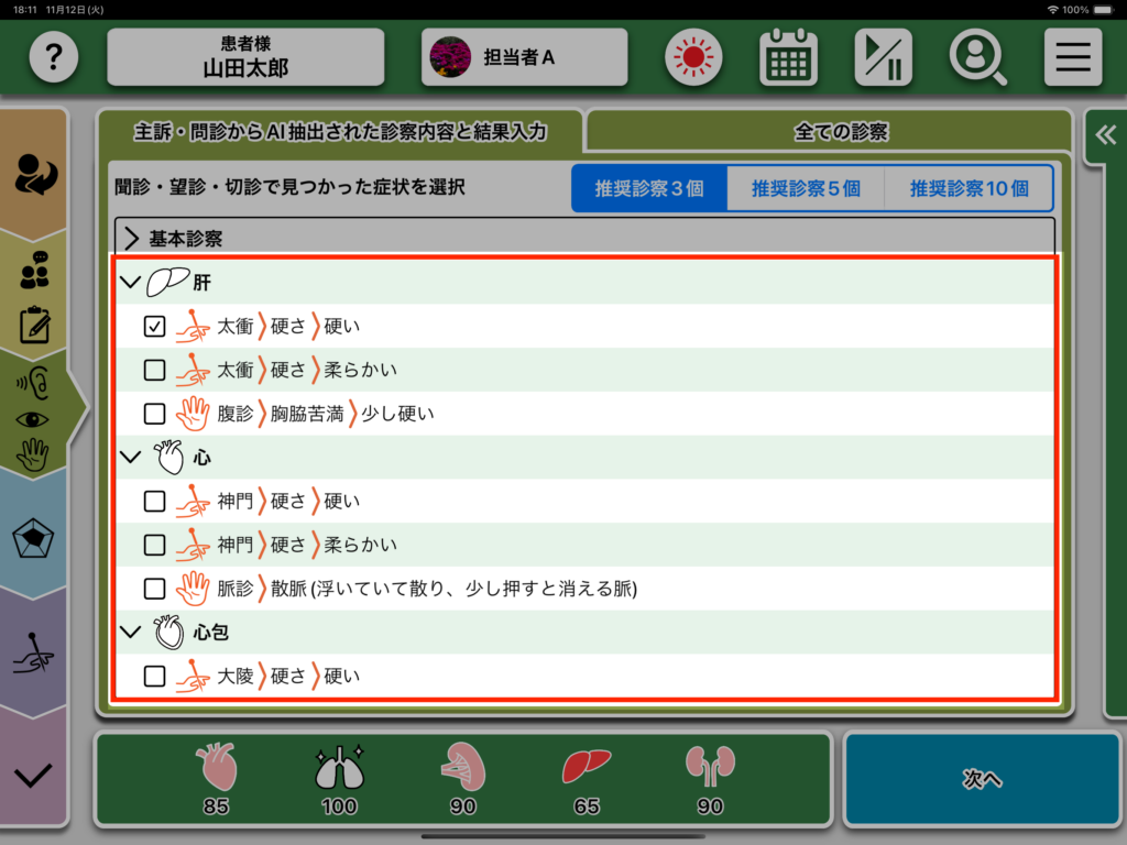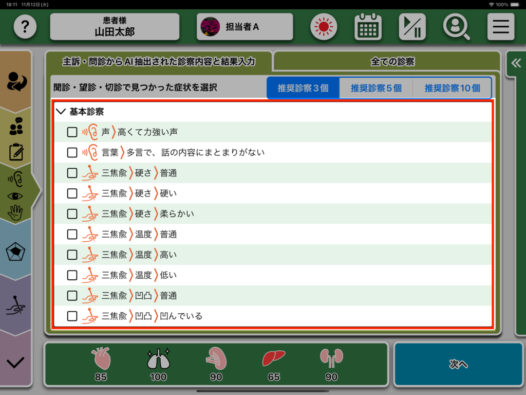 主訴・問診画面で選択した症状を基に抽出した、推奨する診察内容の一覧が表示されます