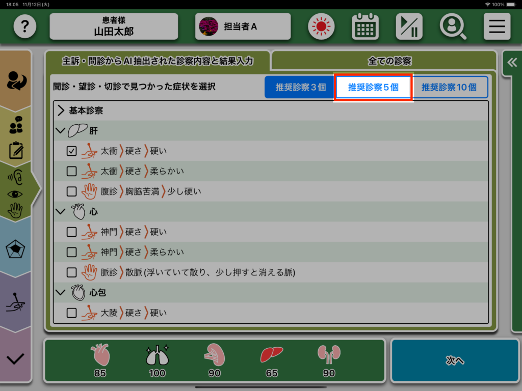各要素に推奨する診察項目を5個表示したい場合は、「推奨診察5個」を押下します