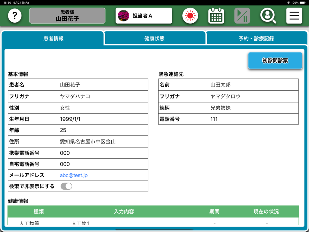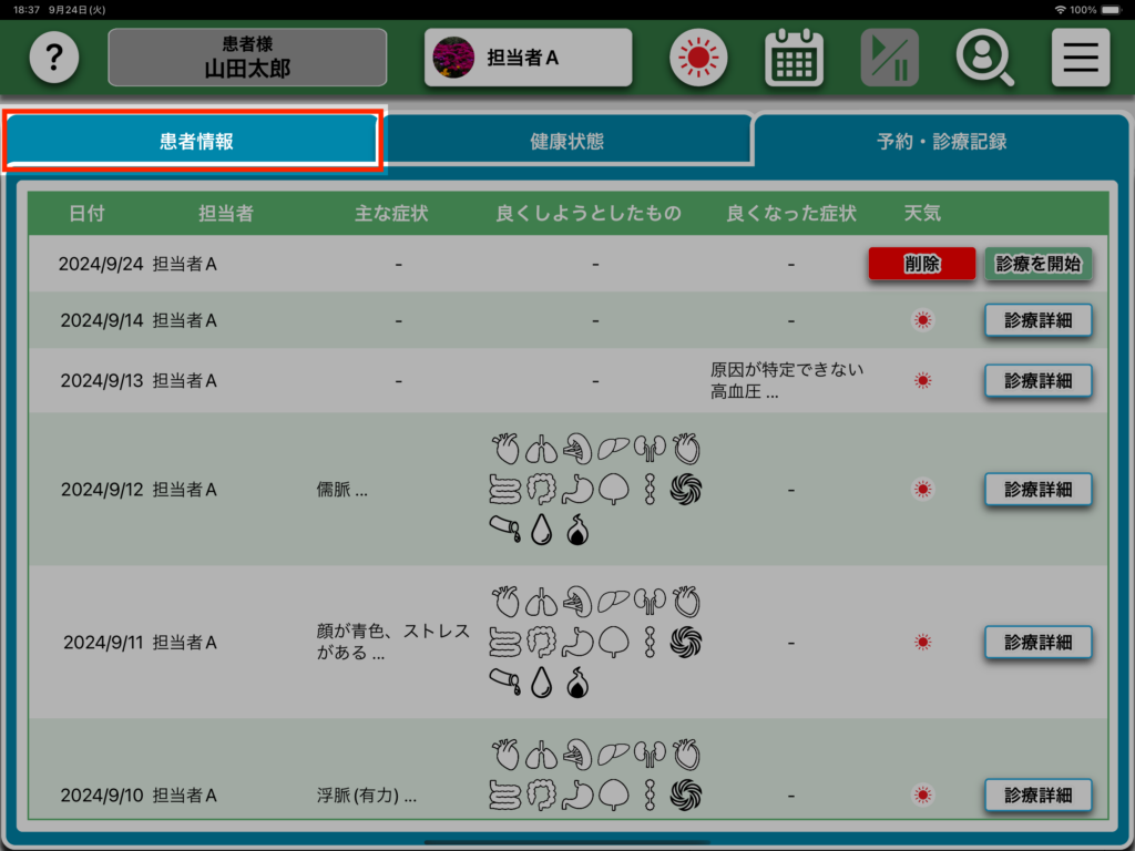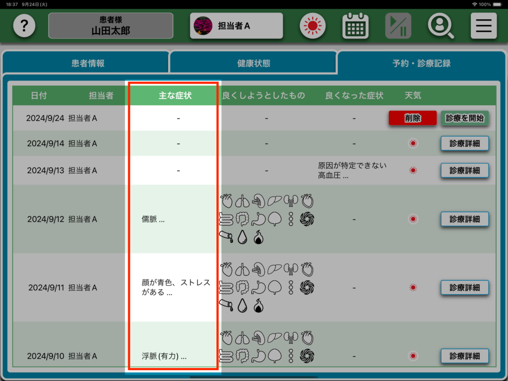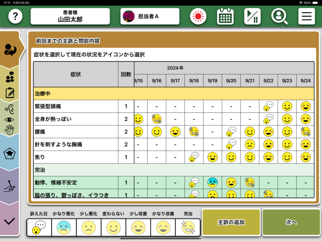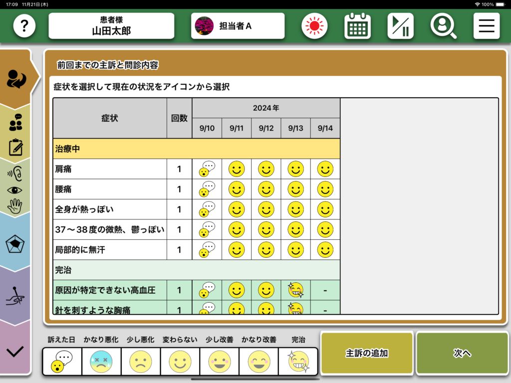 患者様の診療が初回の場合は、主訴・問診画面に遷移します