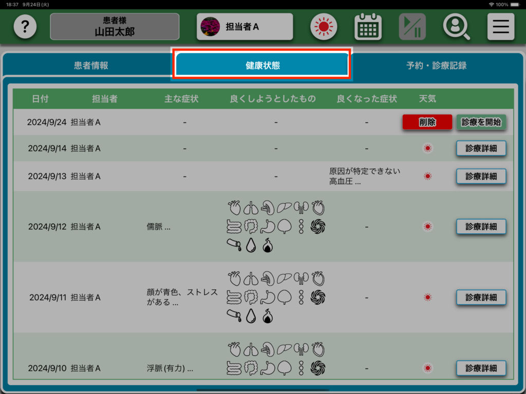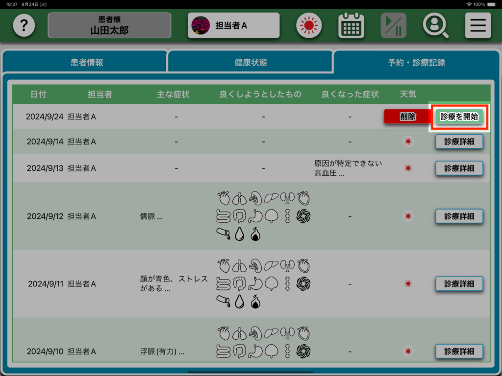 「診療を開始」ボタンを押下してください※「診療を開始」ボタンは、診療が完了していない場合に表示されます