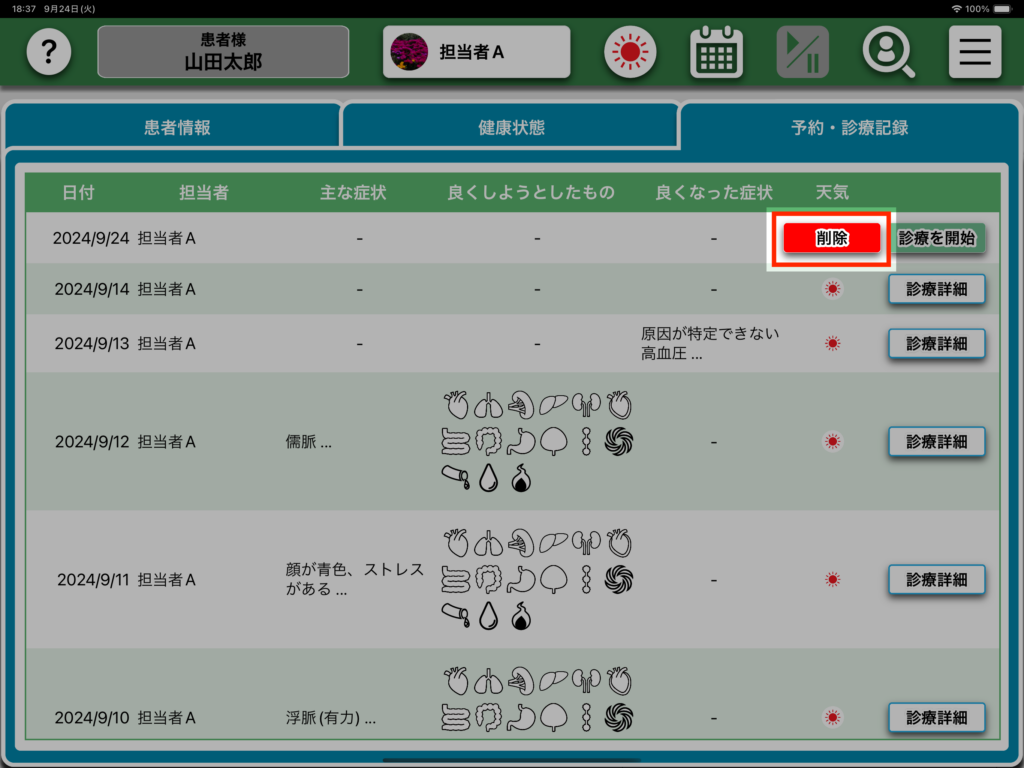 「削除」ボタンを押下してください※「削除」ボタンは、診療を開始していない予約のみ表示されます
