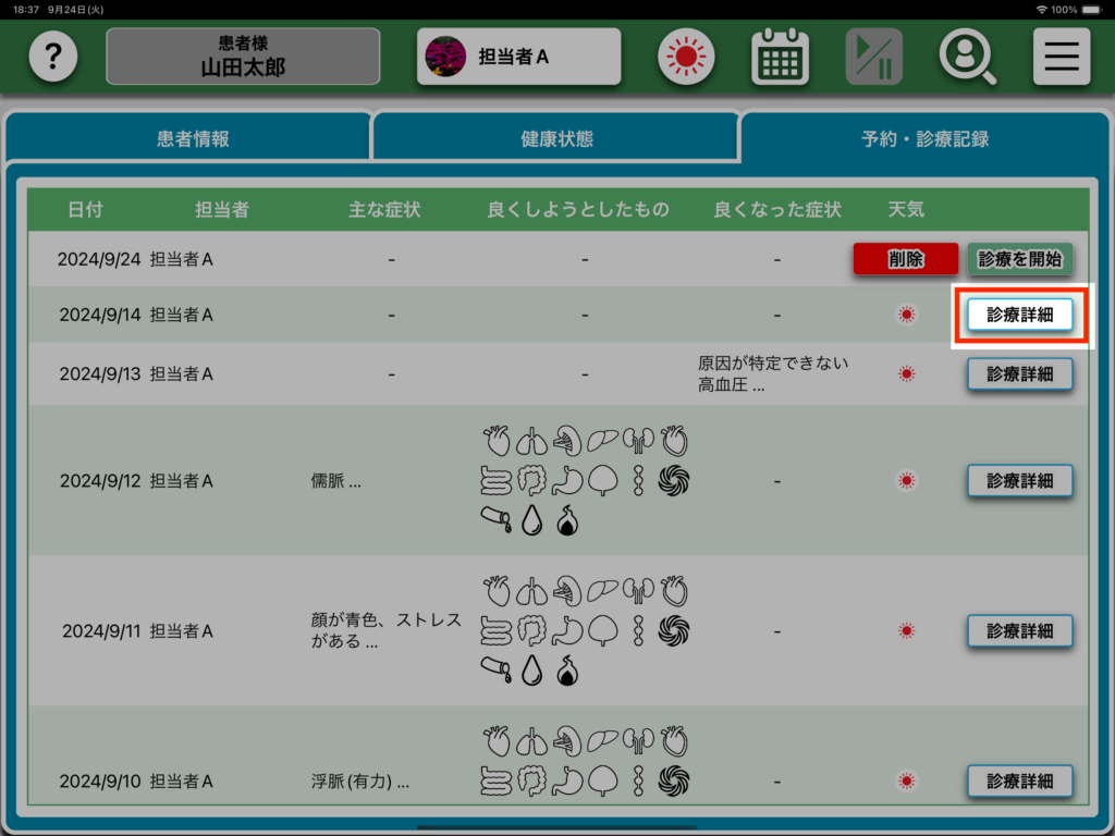 「診療詳細」ボタンを押下してください※「診療詳細」ボタンは、完了した診療に表示されます