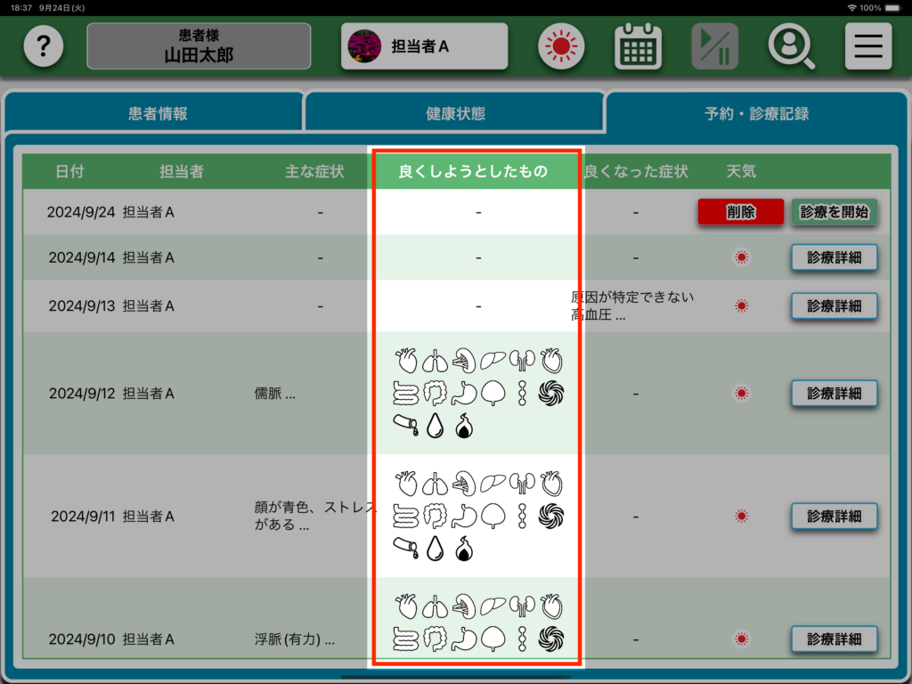 聞診・望診・切診で選択した症状が表示されます※聞診・望診・切診については、聞診・望診・切診画面を参照してください