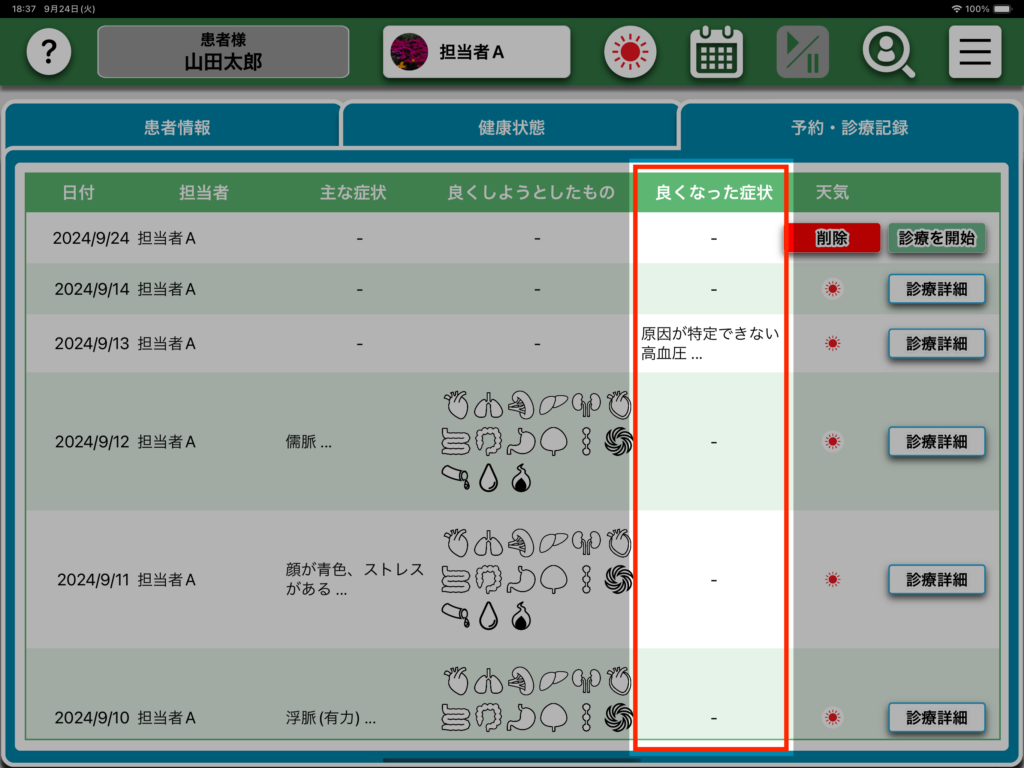 完治した症状が表示されます※完治した症状については、再診画面、主訴・問診画面を参照してください