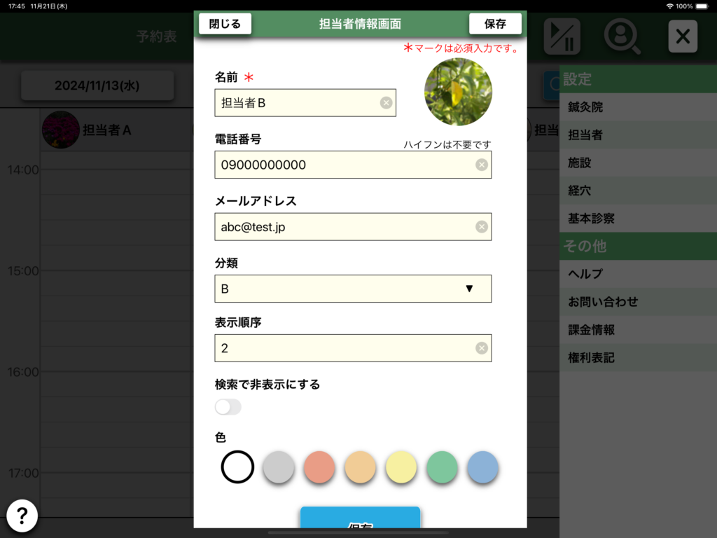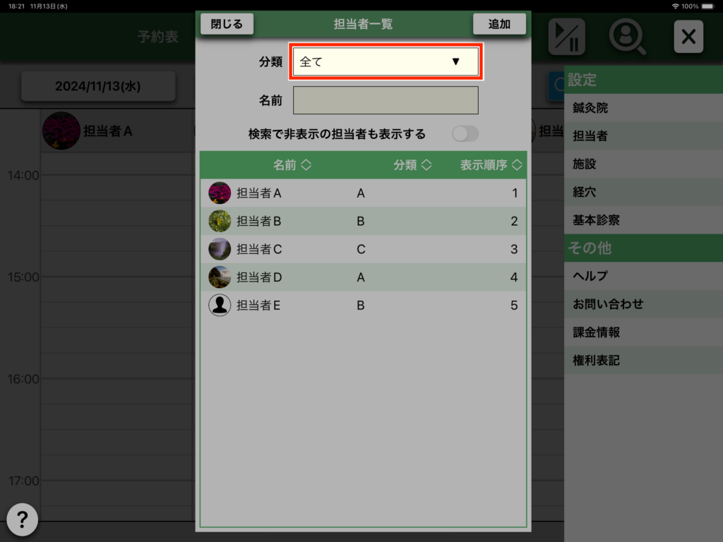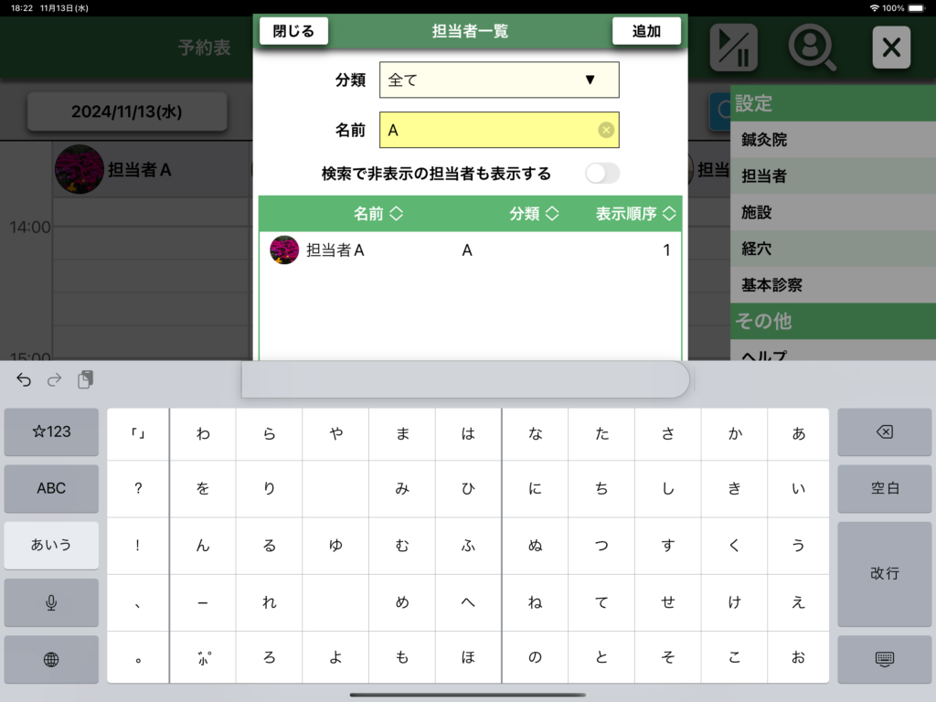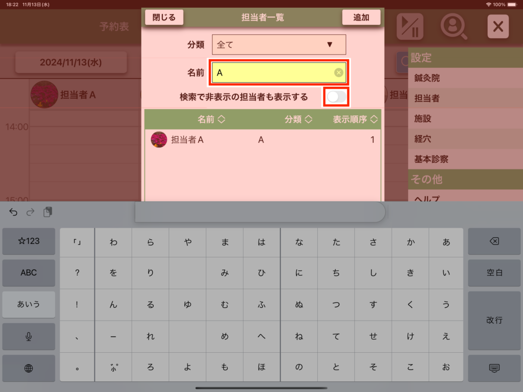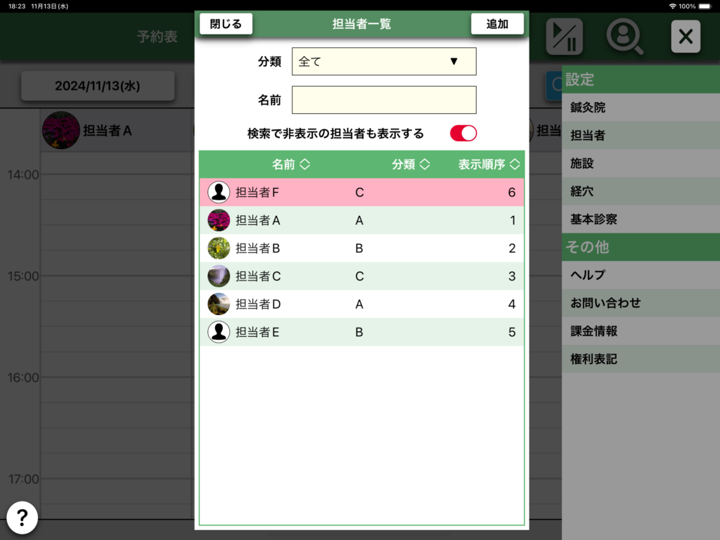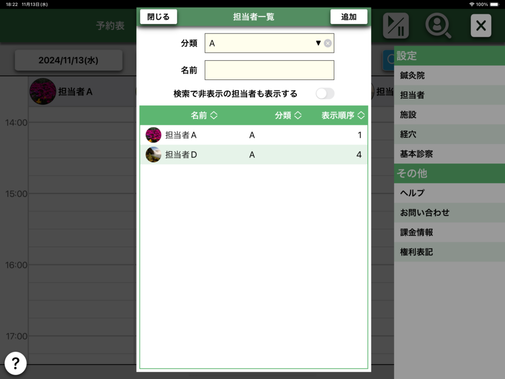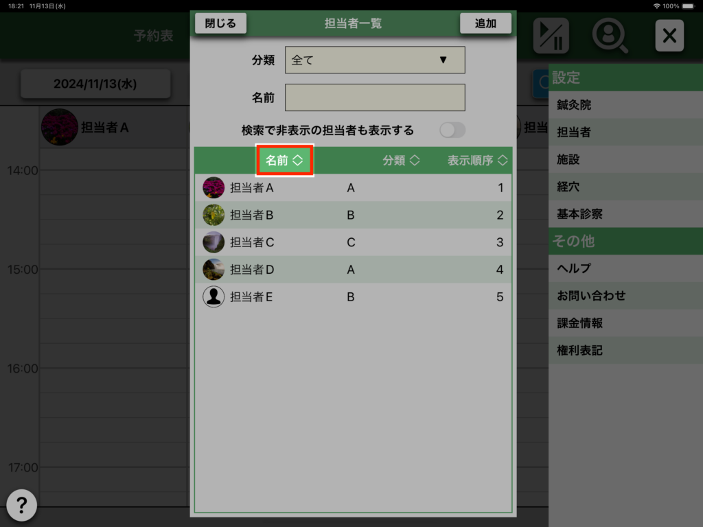 「名前」に入力した値が担当者の名前に含まれる担当者が表示されます