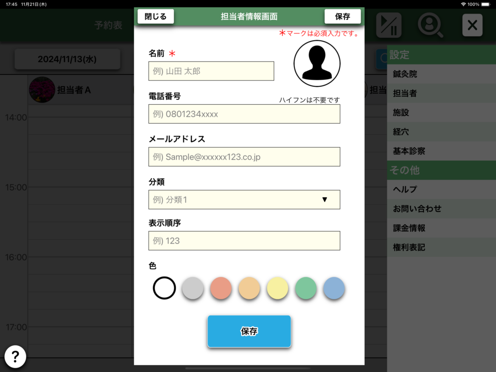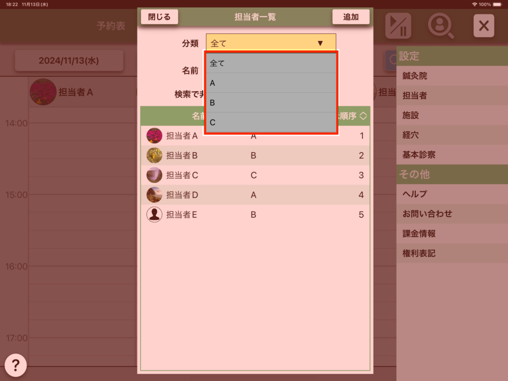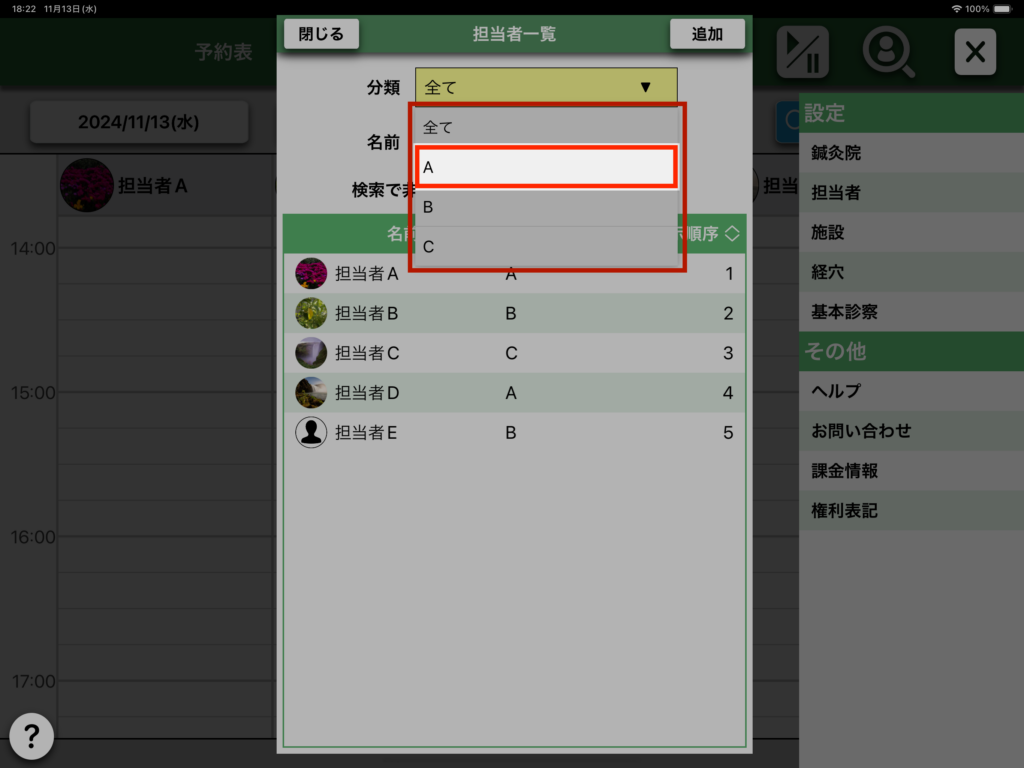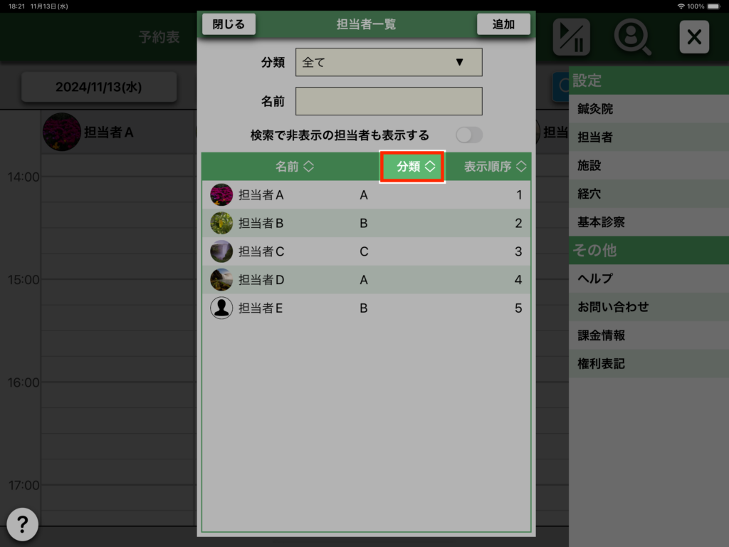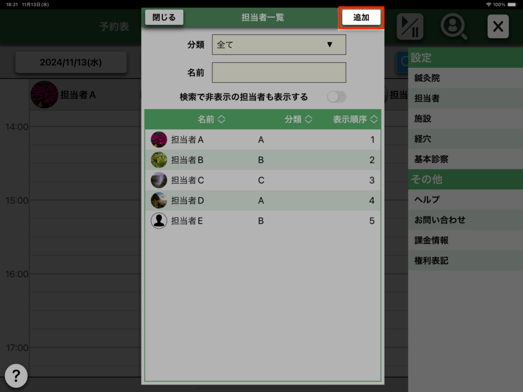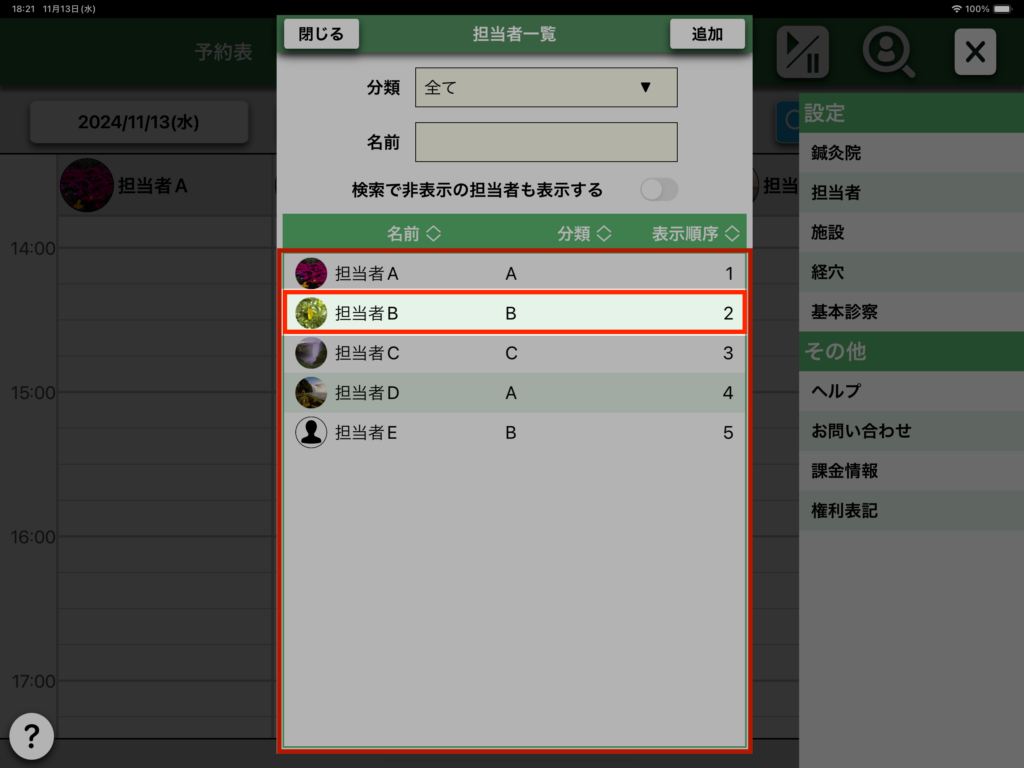 (施設一覧画面の場合は、「担当者」を「施設」に置き換えてください)