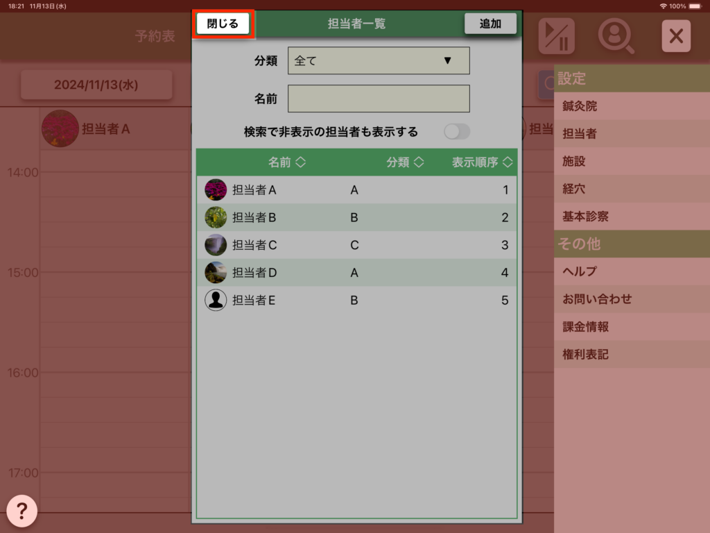 担当者一覧画面、施設一覧画面を閉じる場合は、左上の「閉じるボタン」、又は